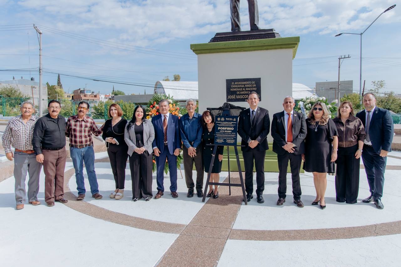 H. Ciudad de Chihuahua, Chih., a 6 de octubre de 2025.- En el marco del Día Mundial del Docente, el alcalde de Chihuahua, Marco Bonilla, develó una placa en conmemoración de Porfirio Loya Ibarbo, nombre que se adhirió a la rotonda de maestros ilustres en el parque El Palomar, por su destacada labor en pro de la educación.